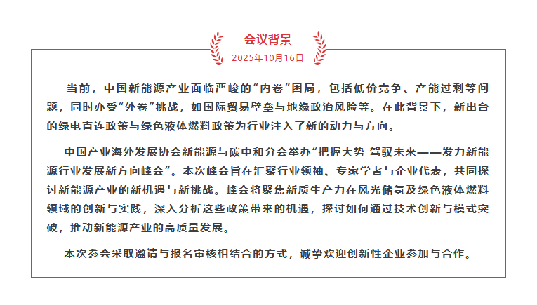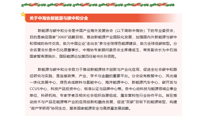 中海协新能源与碳中和分会作为中国产业海外发展协会旗下的专业委员会,是连接政策、产业、学术与金融的重要平台。分会名誉会长由中石化原董事长、党组书记傅成玉担任,常务副会长由中石油经济技术研究院原院长、国际能源论坛第四任秘书长孙贤胜担任,在新能源与碳中和领域具有重要影响力。本次峰会以“把握大势 驾驭未来”为主题,将深入探讨新能源产业发展的新趋势、新机遇和新挑战。会议将围绕新能源技术创新、产业化应用、国际合作等关键议题展开讨论,为推动新能源产业高质量发展提供智力支持。